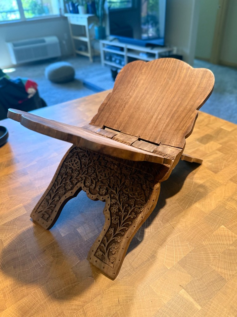I wanted to show off this antique rehal I bought at Le Stuff Antique Mall in downtown Hillsboro, Oregon. The rehal is a traditional folding stand used to elevate sacred texts during recitation. Carved from a single piece of wood, this piece incorporates floral and geometric motifs, showcasing the blend of Indian subcontinent craftsmanship and Islamic design traditions.