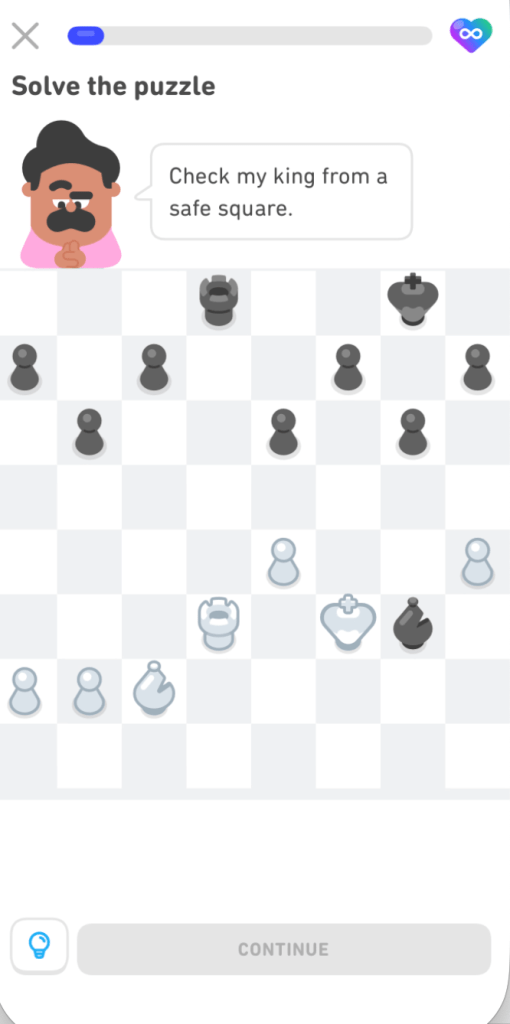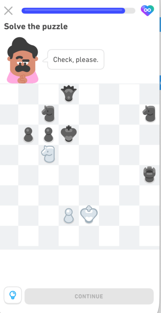 I logged into the Duolingo app on my phone last night and discovered they now offer a Chess course. I understand the piece movements and the game’s objective, but I haven’t developed my playing skills. I decided to try it.